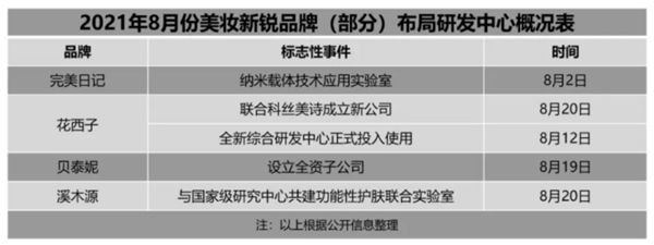 回顾近几年快速崛起的品牌,持续的创新和突破成为大部分品牌的有效路径。例如,国产化妆品新锐品牌完美日记、花西子、薇诺娜和溪木源,在去年8月2日至20日的短短19天中,陆续官宣布局研发中心。