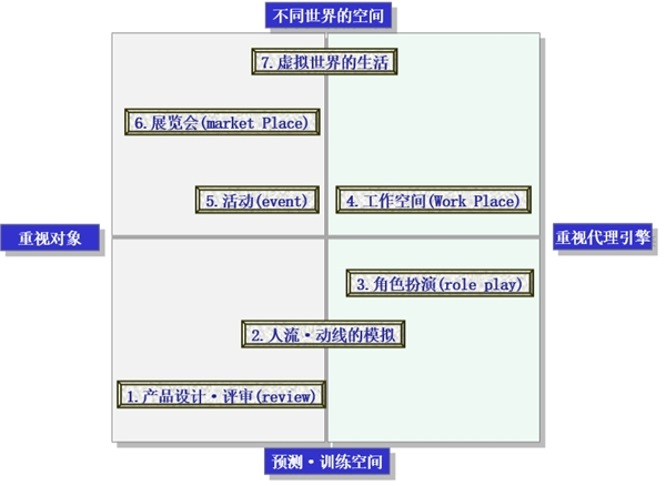 基于此,沙文灏提出元宇宙四象限应用法则(如下图)。横轴表示代理引擎与构成对象的侧重点,在以构成对象为重点的元宇宙场景中,可操作类产品是主角,avatar的表达能力并不重压,如产品设计/评估/赏析,需要着重拟真呈现产品的真实状态,而在以工作空间或是角色扮演类为主的元宇宙中,代理引擎的表达能力则是关键。纵轴表示虚拟空间里的时间可编辑性,下部分表示虚拟空间中没有时间概念,随意编辑、快进快退等,适用于各类模拟训练、应急演练、人流动线等;上部则是有固定时间流逝速度的虚拟空间,一般与物理世界的时间同步。
