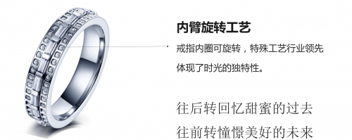 “会转动的珠宝”则是指将千叶珠宝利用连续铸造拉管的机械加工过程使金属更致密,同时通过高温消除金属内部的内应力。每一件千叶的戒指,都是经过抗变形、高精度加工后的四个分件组合成可以转动的饰品,才可以确保旋转顺畅和康温差抗压力不变形。
