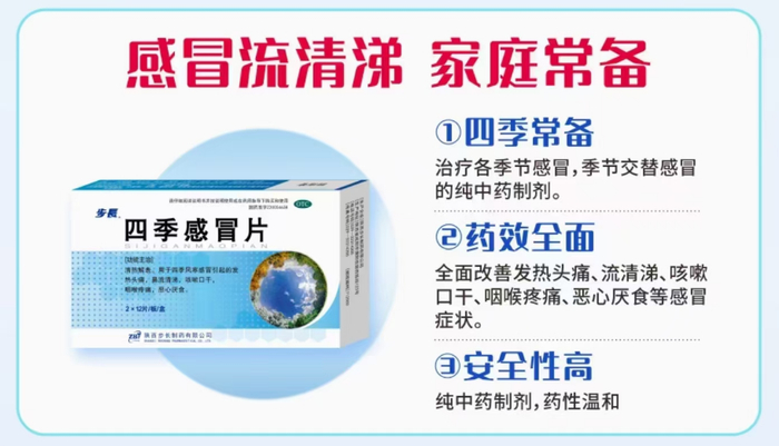 四季感冒片由紫苏叶、荆芥、连翘、大青叶、防风、桔梗、陈皮、香附、甘草九味中药精制而成。功能主治:清热解表。用于四季风寒感冒引起的头疼,流清涕,咳嗽口干,咽喉疼痛,恶心厌食。对于新冠病毒感染及普通感冒者出现的高热、头痛、四肢酸痛、全身乏力、鼻塞流涕、口干咽痛、咳嗽多痰、流清涕、发热、头痛、乏力效果明显,同时方中含有紫苏叶、陈皮促进胃肠蠕动,对于消化不良、厌食、恶心也有很好的效果。疗效全面,安全性高,推荐四季常备!