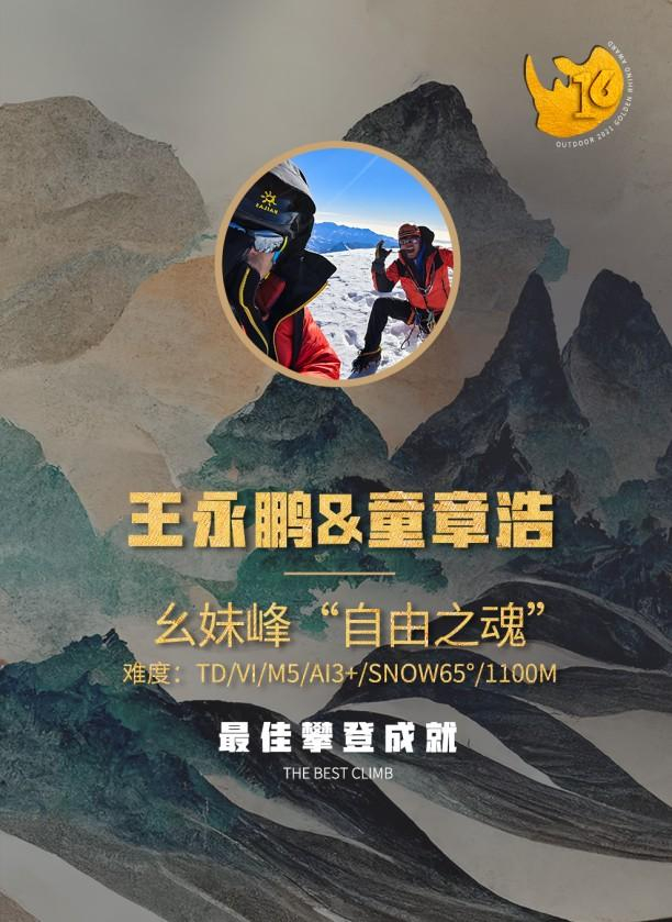 在同一奖项提名中,童章浩与王永鹏不是唯一完攀幺妹峰“自由之魂”路线的挑战者,但他们却打造了独属于自己的攀登纪录,分别成为最年轻的幺妹峰登顶者和第一个登顶幺妹峰的四姑娘山本地人。此次攀登之约可谓是一拍即合,起初是王永鹏向童章浩发出邀请,童章浩一句“走”他们便说走就走,带上装备动身前往四姑娘山。12月5日两人抵达大本营,9日完成登顶,一共耗时5天,成功登顶幺妹峰。登顶的路上挑战重重, 线路底部断裂的冰柱、因温度升高造成的线路落石、不慎滑脱的冰镐……但都被他们一一克服,在攀登过程中展现出的探索及先锋意识更是对凯乐石“探索未知,硬刚到底”的“中国硬壳”精神的生动诠释。