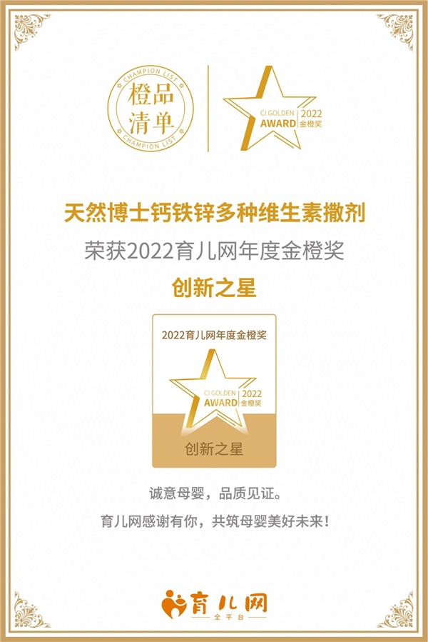 育儿网妈妈口碑之选坚持“无水军、无干预、真实用户、真实口碑”原则,由100%真实妈妈选出母婴用品好货,为新母婴人群尤其是新手妈妈提供母婴好物剁手指南。经过激烈评选,天然博士钙铁锌多种维生素撒剂凭借分阶营养+优质原料+先进生产工艺脱颖而出,获得专业医生专家、资深母婴媒体人、国家高级育婴师组成的专业评委阵容的高度认可,荣获“2022育儿网年度金橙奖创新之星”。
