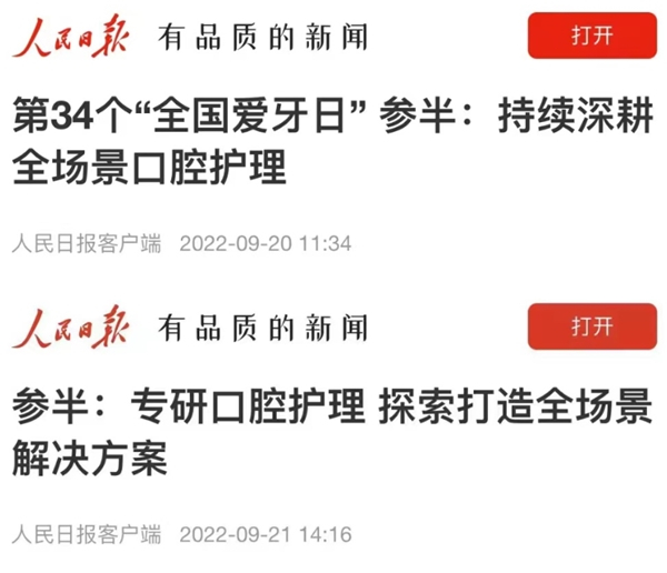 参半在全民口腔健康道路上的努力受到了主流媒体的关注和认可,2022年9月20日,在第34个全国爱牙日,参半作为新锐口腔护理品牌的代表,旗下益生菌漱口水产品被人民日报特邀收录于其制作的第34个全国爱牙日科普视频内。人民日报也对参半进行了两篇深度报道,肯定了参半在全民口腔健康道路上的努力和贡献。