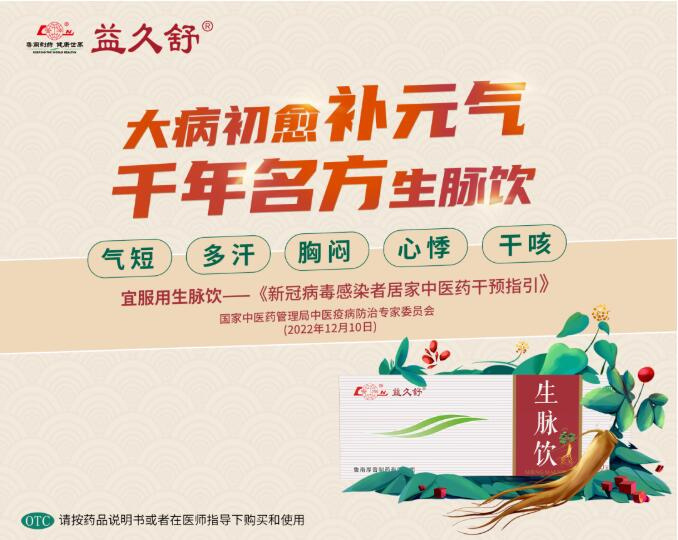 益久舒®生脉饮源自金代张元素《医学启源》中“生脉散”,在《中成药防治新型冠状病毒肺炎专家共识(2022)》等新冠防治的多个指南共识中作为推荐用药,可以补肺益肾,用于气短、多汗、胸闷、心悸的康复期患者,疗效确切。