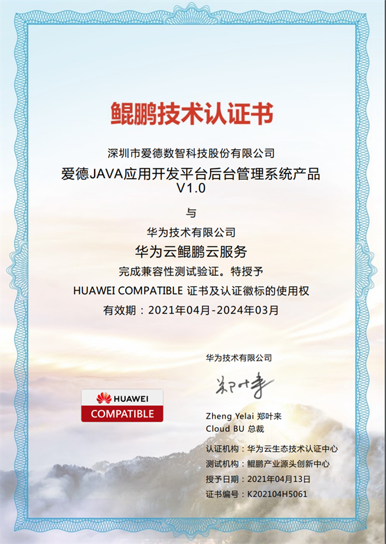 ③2021年4月,爱德JAVA应用开发平台后台管理系统产品V1.0通过华为云鲲鹏云服务兼容性测试验证,完成兼容性测试的鲲鹏云高阶服务包括GaussDB(for MySQL)、分布式消息队列DMS、分布式缓存服务DCS、云容器引擎CCE等。