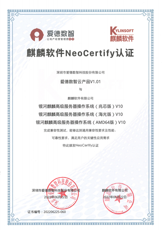 2022年6月,基于爱德JAVA应用开发平台构建的爱德数智云产品V1.01,通过银河麒麟高级服务器操作系统的兼容性测试验证,取得NeoCertify认证证书。