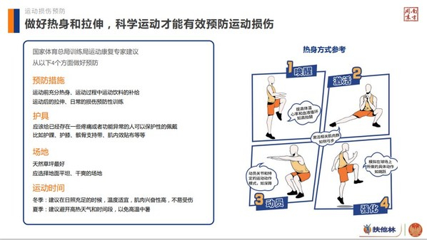 报告结果显示,科学的运动管理和运动知识储备对于预防运动损伤十分重要,在遭遇过运动损伤的职场人群中,有60%缺乏科学的热身,57%缺乏科学运动知识储备。因此,正确的运动损伤预防和科学健康的运动指导十分关键。扶他林邀请国家体育总局训练局康复专家,从预防措施、护具、场地选择、运动时间上给出了专业意见。