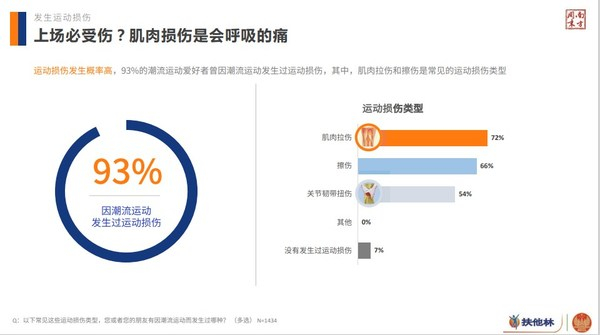 除了锻炼身体,当代职场人运动生活的社交属性突出,满足社交需求,彰显个性也是职场人尝试潮流运动的驱动力。然而,《调研报告》显示,即使潮流运动已经在职场获得青睐,但仍有54%的职场人因为可能存在的运动损伤风险而对潮流运动望而却步。且有93%的潮流运动爱好者,曾因潮流运动发生过运动损伤。
