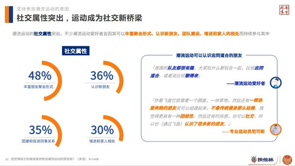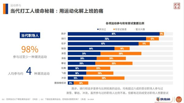 《调研报告》以定量问卷结合深度访谈相结合的形式展开。共回收1464份有效样本,邀请专业运动员代表、扶他林“突破行动派”代表范可新、潮流运动爱好者和国家体育总局训练局康复专家参与访谈。《调研报告》从潮流运动参与现状、运动生活中的文化认同、科学运动认知及行为三个方面洞察了当代职场人运动生活现状与趋势,并给予了职场人科学运动建议。