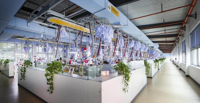 除了覆盖全面外,智能工厂还大程度提高了工作效率、优化了工作结果。以智能裁剪和智能吊挂系统举例,智能裁剪可以有效确保面料的裁片精确度,裁剪效率较传统裁剪提升百分之二十以上;而智能吊挂系统则以效率优先的标准来判定并分配产品站位,实现生产线的可视化管理和信息化管理,使操作人员手持率减少百分之九十,较传统生产模式效率提高近百分之三十五。