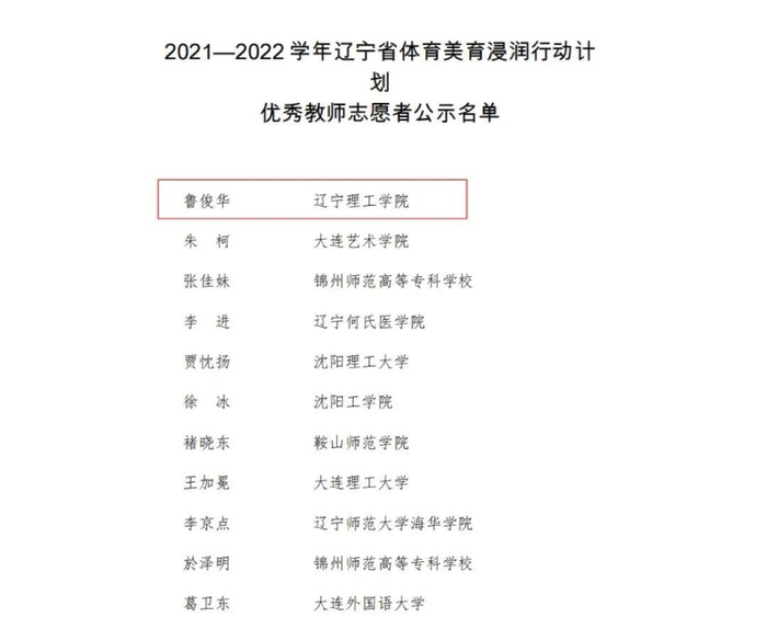 12月5日,辽宁省教育厅发布《关于评选2021—2022学年辽宁省体育美育浸润行动计划工作先进单位和优秀教师志愿者的通知》,辽宁理工学院再度被评为2021—2022学年辽宁省体育美育浸润行动计划先进单位,体育学院鲁俊华、李健老师被评为辽宁省体育美育浸润行动计划优秀教师志愿者。