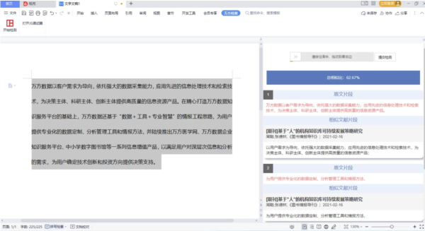 除了传统查重服务模式,为满足广大师生论文实时检测的需求,在过程中修改,避免“从头再来”,万方检测特推出“边写边查”功能,支持在线改重,可随时分层分段进行查重和修改,进而降低整篇论文的重复率,提高论文创作效率。
