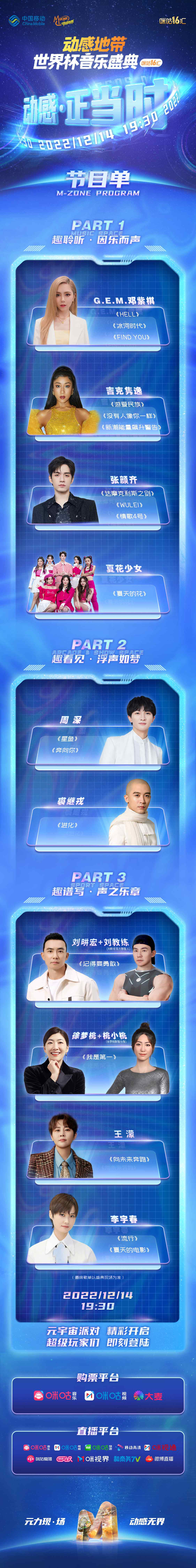 本届盛典由2022卡塔尔世界杯持权转播商中国移动咪咕主办,分为12月14日首秀和12月16日大秀两场。首秀舞台将于今晚盛大启幕,球迷和乐迷可通过咪咕音乐、咪咕视频、咪咕快游、移动高清、咪视通、咪咕爱唱、移动云VR等平台,共同踏入动感地带世界杯音乐盛典·咪咕汇的元宇宙中,享受音乐狂欢。