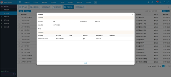 OA系统中固定资产在公司内部部门员工之间转移调拨,经移入、出部门负责人签字确认后交与行政部。移出部门先将需要转移的固定资产移交行政部,行政部办理转移登记备案后,移入部门再到行政部进行领用,从而以便落实新的使用人的保管。