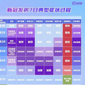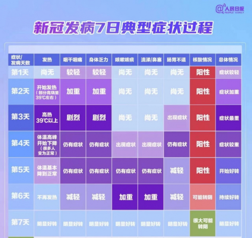 12月10日“人民日报”公众号发布了一篇名为“新冠典型症状及对照常用药物参考表”的文章,其中清晰地介绍了新冠发病7日典型症状过程,从这份参考表中,我们可以看出在感染早期会出现咽干咽痛、身体乏力、轻微发热的症状。