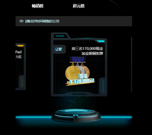 日榜奖项为当日销量第一名,奖励 HUAWEI MatePad 一台;周榜奖项为当周销量第一名,奖为PICO 4 VR-体机与现金 5000 元;总榜奖项为赛事累计销售的前三名。总榜第一名可获得 10 万元现金奖励+金牌;第二名可获得 5 万元现金奖励+银牌;第三名可获得 2 万元现金奖励+铜牌。