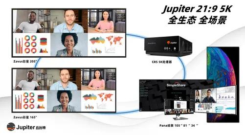 Jupiter21:9 5K 企业协作整体方案着眼于未来,提供上至205寸、下至34寸的多款21:9 5K屏幕,同时提供CRS-5K处理器以及SimpleShare软件,为客户提供专业的21:9屏幕全场景、全生态的解决方案。