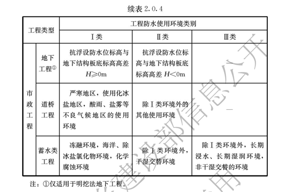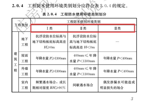 工程防水使用环境类别分为Ⅰ类、Ⅱ类、Ⅲ类;