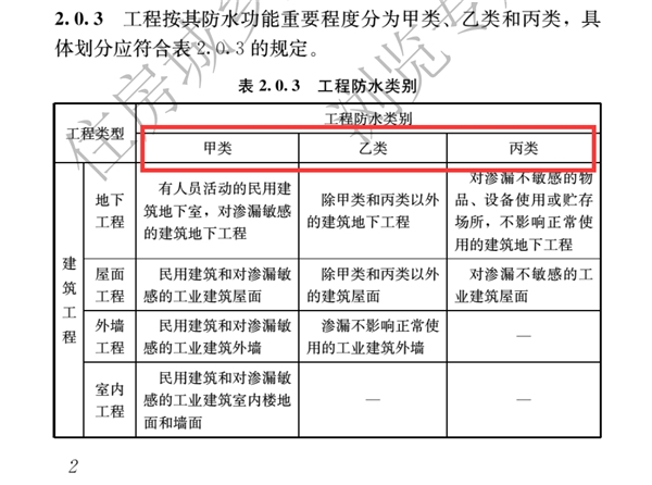 在这之前,我们先来看几个分类,工程按其防水功能重要程度分为甲类、乙类和丙类;