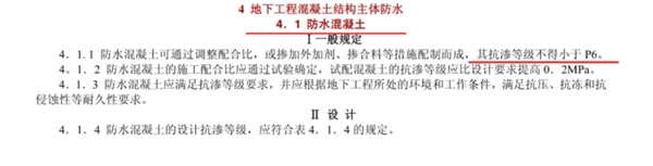 这在国家标准《地下工程防水技术规范》GB50108-2008中有明确规定,即防水混凝土可通过调整配合比,或掺加外加剂、掺合料等措施配制而成,其抗渗等级不得小于P6。