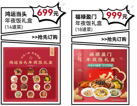 保姆式切配、餐厅级调味、专业化锁鲜,专注预制菜菜品研发与创新的珍味小梅园得到了越来越多消费者的认可,随着“预制年夜饭”场景的开启,消费者也开始对此充满了期待。为此,珍味小梅园正式开售适合多口之家的2023全新年夜饭礼盒,包括售价699元、含14道大菜的鸿运当头礼盒,售价999元、含18道大菜的福禄盈门礼盒,简单方便易操作,让这个年夜套餐美味又豪气。