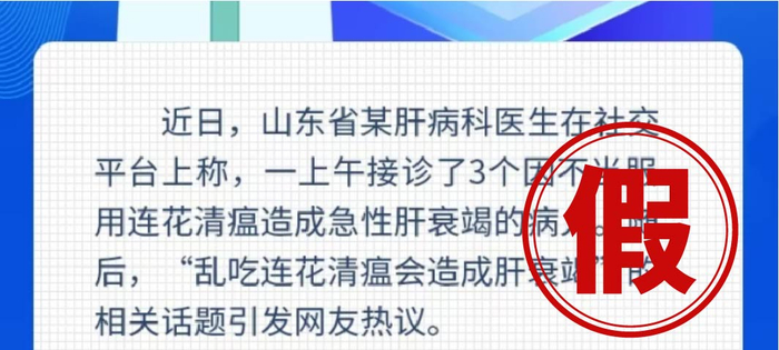 这则传言起因是网络出现“山东某医生在社交平台称:一上午接诊3个因服用连花清瘟造成急性肝损伤的病人”,所以出现“乱吃连花清瘟出现肝衰竭”的谣言。