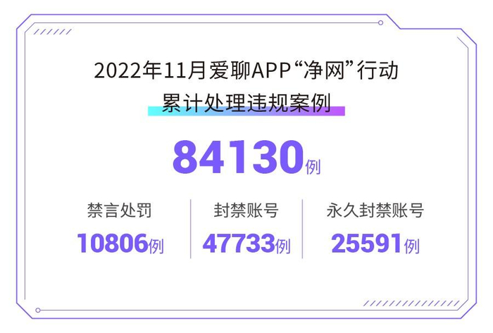 2022年11月,爱聊APP“净网”行动累计处理违规案例84130例,禁言处罚10806例,封禁账号47733例,永久封禁账号25591例。