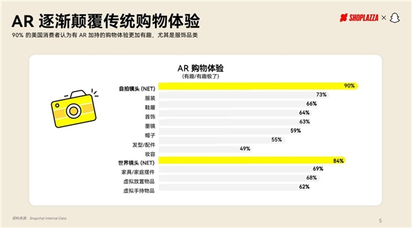 消费者对高品质的追求不仅体现在商品上,更体现在购物体验方面。《报告》指出,随着智能设备及网购的普及,将 AR 技术与社交电商结合,将成为线上购物的常态。90% 的美国消费者表示,有 AR 加持的购物体验更加有趣。对消费者而言,虚拟试穿和 AR 购物可为消费者提供更流畅的购物体验;对商户而言, AR 技术可以提高转化率并降低退货率,这对于美妆、服饰等品类尤为有利。拥有 2.5 亿 AR 用户的 Snapchat,也成为品牌尝试 AR 营销首选。