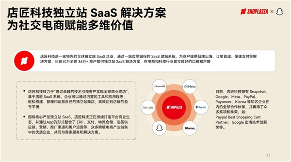 12 月 15 日,全球独立站 SaaS 企业店匠科技(Shoplazza)与科技公司 Snap (NYSE: SNAP) ,在百度国际的助力下,发布了《2022 全球社交电商趋势策略报告》(以下简称《报告》)。《报告》显示,后疫情时代,口碑营销和熟人种草已成为社交购物的主要趋势;消费者对购物体验要求提升,AR(增强现实)技术将颠覆传统购物体验。店匠科技与 Snapchat 将基于此趋势,围绕独立站 SaaS、社交电商营销一站式解决方案,助力品牌企业探索建立合适的社交电商营销策略,为出海企业连接全球消费者、解锁商机提供新思路与新解法。