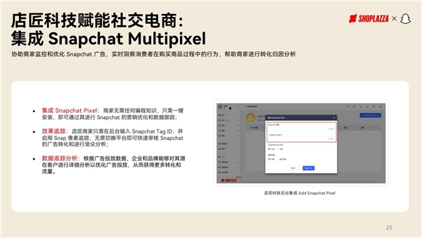 此外,店匠科技还为商户提供包含 Snapchat 在内的多家热门社交媒体平台的一站式广告管理、商品同步等功能,商户无需在多个社交媒体平台来回切换,即可在店匠后台追踪广告投放效果。此外,在商品同步功能的加持下,商户可以为消费者提供多平台、全渠道的购物体验;同时,还支持消费者直接从社交媒体购买产品或访问品牌独立站,从而为品牌沉淀更多私域流量。值得注意的是,目前店匠科技也通过后台集成了 Add Snapchat Pixel,商户只需一键安装,即可通过其进行 Snapchat 的营销优化和数据跟踪。