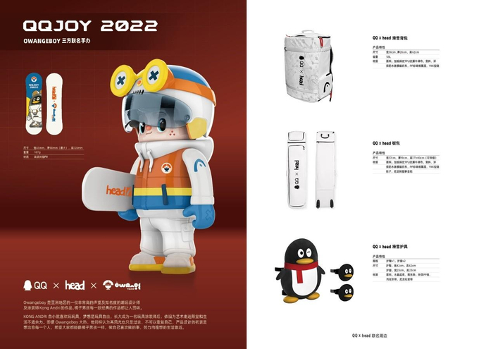 针对QQ x HEAD联名款一同推出的还有与潮玩品牌橘子男孩Owangeboy联名滑雪手办,潮酷男孩Owangeboy穿戴体现3方元素的装备,头盔、雪板及头部和双臂都采用磁吸的链接形式,具有很好的把玩手感,全球限量100套,并附带独一无二的限量编号身份卡。