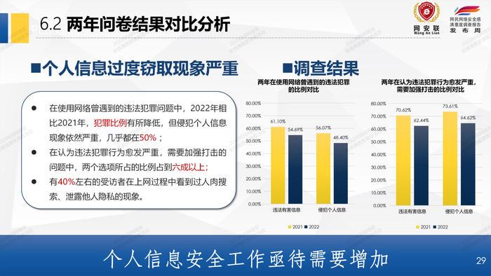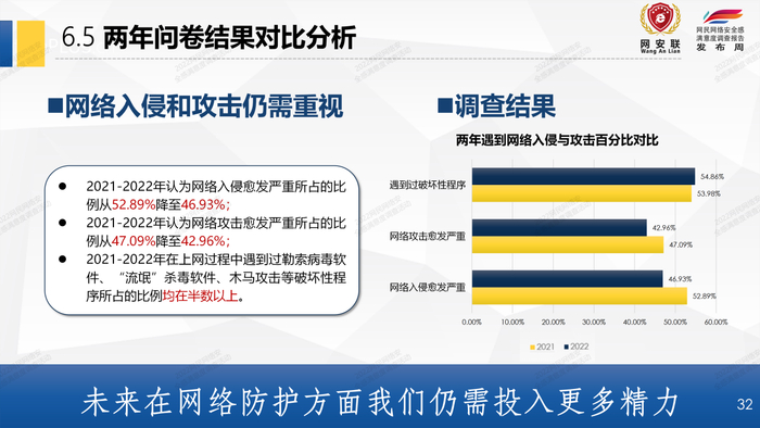 通过与2021年相关调查情况的对比,2022年的报告进一步深刻全面地反映了网民群众对我国网络空间安全建设的满意程度的变化,以及面对网络违法犯罪行为时应对措施的变化。