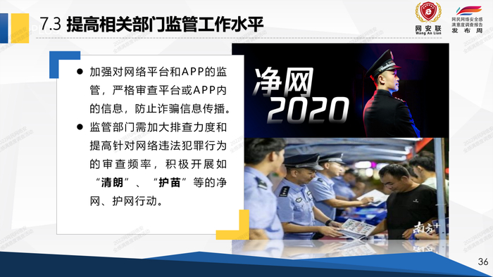 从调查的数据来看,网民对于网信和公安部门开展的清朗净网活动的满意度是有所上升的,这是对我们国家在治理网络诈骗、净化网络环境、净化网络环境等工作的肯定。但是在投诉的过程当中,很少有人选择到网站去投诉,而是选择去网信部门和公安机关报警,而且对网站投诉后的反馈的效果满意度很低,主要原因为:网站平台的自觉性和管理能力比较差、基层网络安全人才投入不足、平台长期以来过于依赖监管部门政府部门的监管和督促。