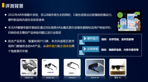 近年来,中国移动终端实验室每年都会定期推出《AR眼镜专题评测报告》(下称报告),通过对比当年年度各款AR头戴式显示设备性能指标及用户体验评价,客观反映AR终端产品体验问题及行业现状,为VR/AR行业发展贡献力量。2022年度的《报告》结合产品形态、销量和用户口碑,选取了INMO Air 、Nreal Air、 Nreal X 、Rokid Air 、雷鸟 Air五款市场热门眼镜形态的AR产品,从硬件能力和主观体验两个角度展开了评测。让我们一起来看看这几款产品的测试表现究竟如何吧!