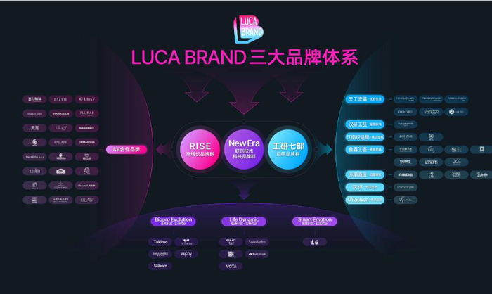 LUCA BRAND品牌群将围绕三大战略方向演进:以联创技术科技品牌群「NewEra」提供全维度的人体抗衰解决方案;以高增长品牌群「RISE」持续培育全球优质的品牌资产;以自研品牌群「工研七部」重塑新消费时代下品牌的全新价值表达。