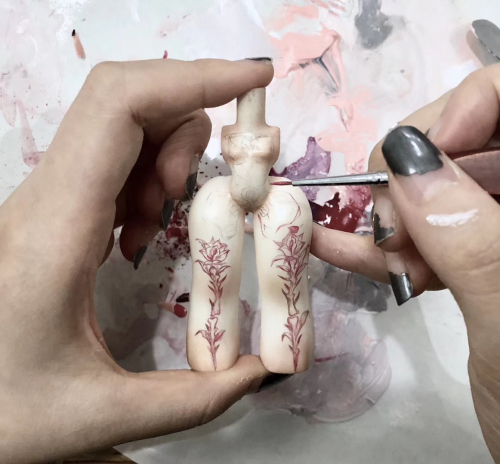 油色部分,最终采用的是仿釉彩的油色风格。可以看到人物面部的嘴巴、眼影及身体四肢上会有一些细小的白色小纹路,其实都是人工上色的时候,用笔刷一笔一笔扫出来的,而这些手工操作有着很大的不稳定性。以及最后的那层高光亮油,对产品未完成部件的储存条件有非常高的要求,对产品最终呈现的效果也会有极大的影响。最后,隐藏款温变的工艺更是经过了多次的温度测算尝试,才达到大家看到的最终效果。