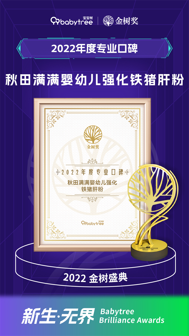 12月14日,由国内母婴头部平台宝宝树创立的,主题为“新生·无界”第八届金树盛典在上海隆重召开,“金树奖”颁奖盛典同期举行。作为备受中国的母婴家庭关注和信赖的消费指南,金树盛典组委会坚持高标准、高质量、高水平,通过消费大数据、行业专业体系、用户投票等多维评选,最终角逐出多项年度大奖。其中,秋田满满婴幼儿强化铁猪肝粉凭借专业、优秀的口碑在众多母婴产品中脱颖而出,斩获“年度专业口碑奖”,秋田满满专为宝宝设计,适合宝宝成长营养所需,每口都安心。