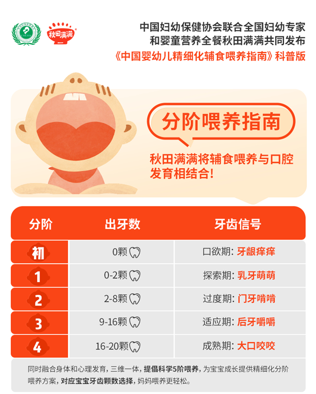 为解决新手爸妈对于辅食喂养的困惑,提高儿童健康水平,加强儿童早期发展。中国妇幼保健协会联合全国妇幼专家和秋田满满共同制定了专门针对中国宝宝的《中国婴幼儿精细化辅食喂养指南》科普版(以下简称《指南》),帮助千万家庭建立科学的喂养标准,让每一个“喂什么”都能找到答案。