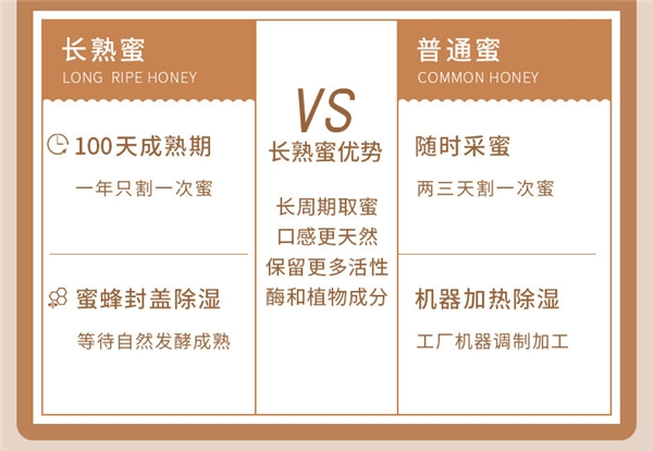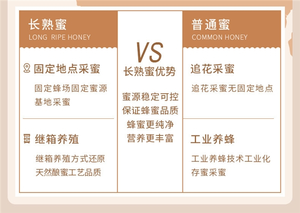 长熟蜜与非长熟蜜最大的不同就是时间的沉淀。在这个节奏匆匆,充斥着浮躁和功利的年代,难能可贵的是坚守初心,定下心,沉住气,以匠人之心,把一件事情做好,做极致,慢工出细活,匠心酿珍品。纯天然的长熟蜜是经过100天以上的自然成熟的高活性好蜂蜜,不抢收,踏踏实实的留下蜂蜜的天然精华和养分,所以其活性酶值可高达16-20,远超国标及欧盟标准。以往通过产地、蜜源等方式对蜂蜜进行划分,或许可以对蜂蜜品牌的名气、蜂蜜本身的保健作用做出一个评价,但是对于蜂蜜中包含的营养价值却不能很好地区分。而长熟蜜这一蜂蜜种类的出现,将蜂蜜市场明确的划分成为长熟蜜和非长熟蜜这两大品类,让消费者清楚的认知到好蜂蜜就是长熟蜜。