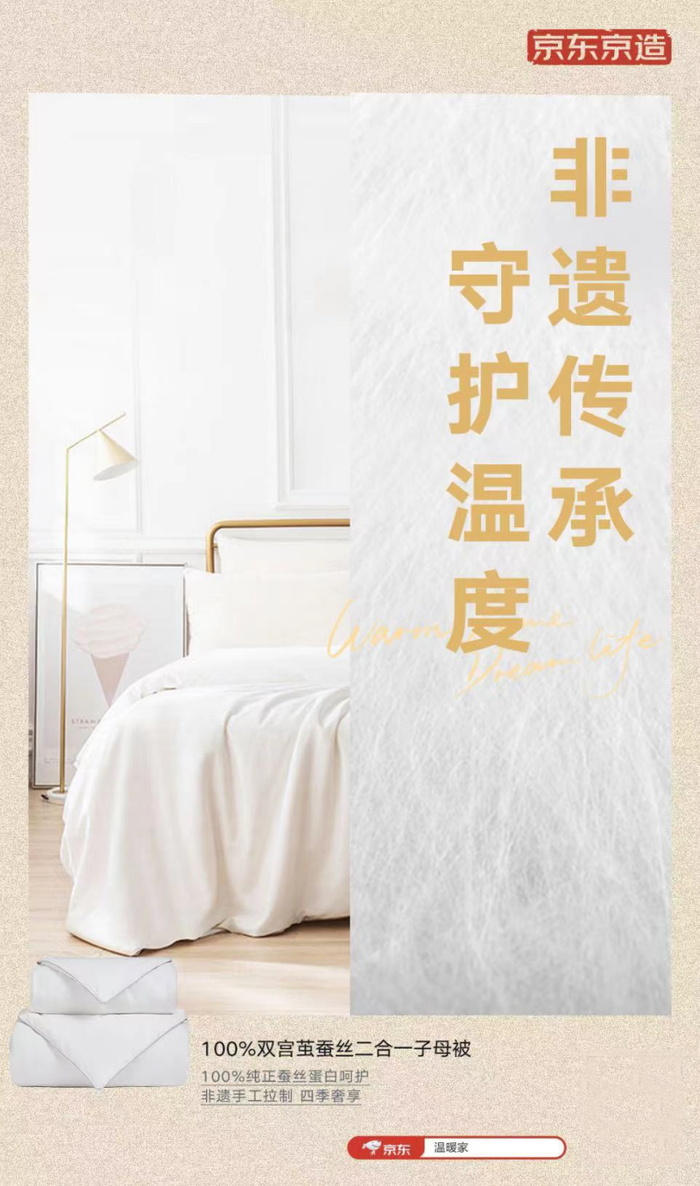 活动期间,京东京造家纺产品经理现场向大家讲解了传承千年的非遗蚕丝纺织技艺。带领到场打卡的网红达人一起从蚕茧到蚕丝再到蚕丝产品,全方位体验了京东京造的真丝家纺产品,Warm-tech系列服饰更是从原料研发开始,给人无微不至的的温暖。