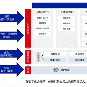 信息技术和人工智能已经深刻地改变了人类的生活和工作方式,特别是人工智能技术的飞速进步为企业的发展带来了巨大机遇和挑战。从发展战略和商业模式的颠覆,到组织架构和管理流程的再造,再到经营方式和组织文化的重塑,在信息技术高速发展的背景下,变革已成为企业运营的常态。国务院国资委在《关于中央企业加快建设世界一流财务管理体系的指导意见》中明确指出,世界一流企业需建成与其相匹配的世界一流财务管理体系,并提出建设世界一流财务管理体系的“1455”框架。数字化转型是建设世界一流企业的必由之路,而财务数字化是建设世界一流企业的重要起点和必备基础,企业构建世界一流财务管理体系应当以财务管理能力升级和财务数字化转型为核心展开,如图1。