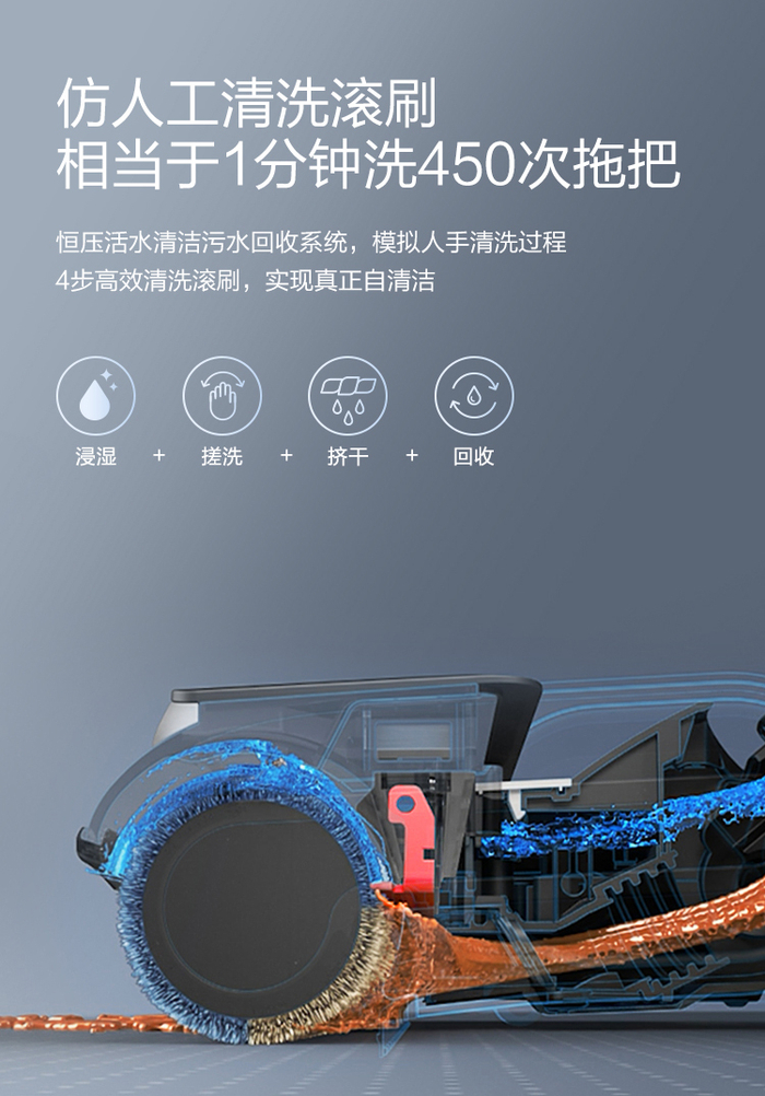 反观传统双滚刷设计,一方面无法适配这一技术应用,滚刷就存在二次污染的风险;同时,双滚刷反而会因滚刷间的缝隙影响污水、湿垃圾的顺畅回收,尤其是遇到宠物毛发等不易回收干净的脏污,易有水渍残留,地板清洁效果更易打折扣。