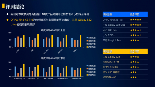 整体而言,《报告》对本次参测的两档合计10款产品进行了测试。在4000元以上的档位中,OPPO Find X5 Pro的音频表现与彩振性能更为出众,在4000元以下档位的手机中,三星 Galaxy S22Ultra的视频表现最好。