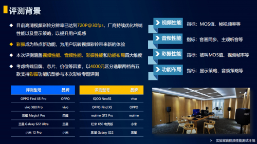 为此,中国移动终端实验室联合中国移动咪咕公司定期制作《中国移动智能终端硬件报告—高清视频彩铃报告》,依托“主观+客观”的全方位评测体系,每年为用户筛选出呈现视频彩铃最佳的手机终端,同时为各终端厂家提供彩铃视频展现的优化提供科学参考。2022年11月,《中国移动2022年智能终端硬件报告—高清视频彩铃报告》(下称《报告》)发布,《报告》以4000元为价格分界线设立4000元以下和4000以上档位,分别选取5款支持彩振功能的机型从“视频性能”、“音频性能”、“彩振性能”和“功能布局”四个维度进行严格评测,四个维度下共有“MOS值”、“帧视频率”、“音画同步”和“视频策略”等多达十四个指标,终端实验室进行了逐一评测,力求让每一段彩铃都完美呈现,让每一个客户在终端上获得绝佳体验。