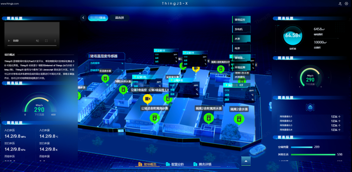 在升级后的ThingJS-X4新版本中,有4000+常用模型,120+一线、二线城市的3D城市模型,5000+园区模型和贴图,288款零代码插件可选择。模型即选即用,直接拖拽即可生成。288款免费插件,同时开放官方插件开发规范,可以轻松实现多样化功能扩展,项目实施更灵活、更轻量化。