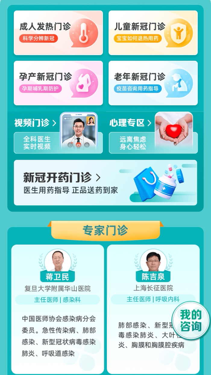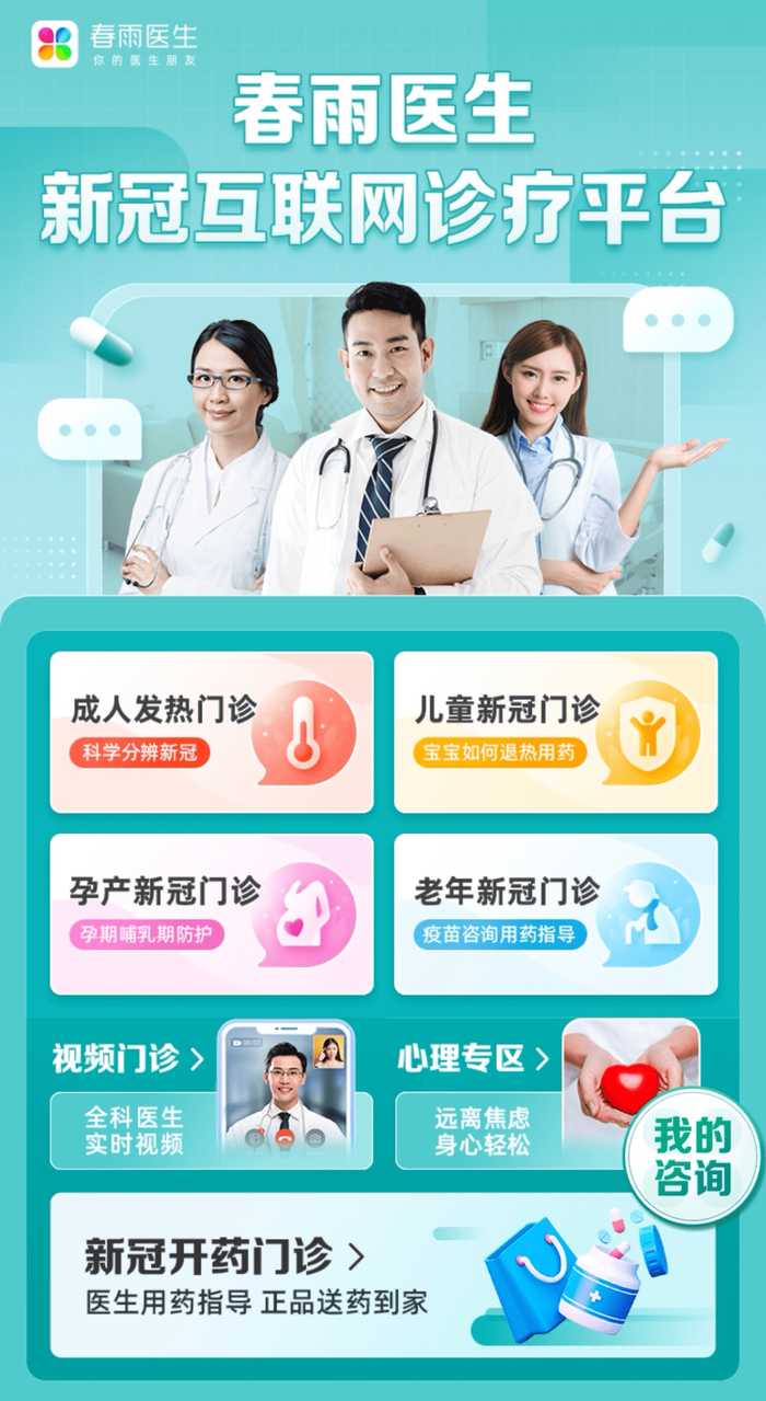 随后,春雨医生又积极贯彻落实《关于做好新冠肺炎互联网医疗服务的通知》,将刚刚快速上线的“春雨新冠线上咨询平台”及时升级为“春雨新冠互联网诊疗平台”,全新加入了“新冠开药门诊”,由拥有在线处方资质的专业优质医生为您直接提供线上诊疗、开方、购药送药一站式服务,更好为公众健康保驾护航。