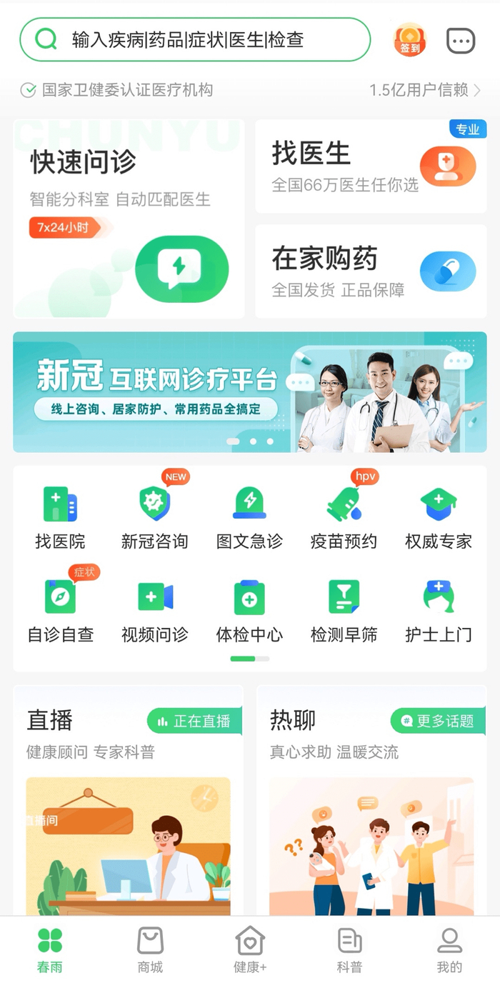 只要打开春雨医生APP或者小程序,您都可以在醒目位置看到【新冠互联网诊疗平台】,点击进入即可享受春雨全面的防疫服务: