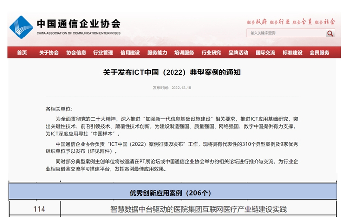 近日,由中国通信企业协会组织的“ICT中国(2022)案例征集及发布”活动结果公示,通用技术环球医疗申报的《智慧数据中台驱动的医院集团互联网医疗产业链建设实践》荣获“ICT中国(2022)案例—优秀创新应用案例”。