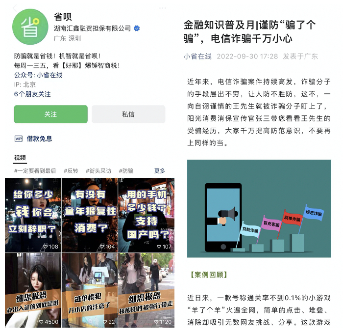疫情之下,国内经济下行,越是大家钱包不鼓的时候,越是要避免不必要的损失。面对骗子层出不穷的骗术,省呗调查研究了各类真实案例,拍摄成网友乐于接受的短视频,发布在公众号、抖音、快手等平台,助力年轻群体提升识骗、防骗的意识。