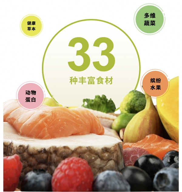 今年诚实一口狗粮家族的这个新成员诚实一口N33,以狗狗需要丰富喂养为出发点,精选33种丰富食材,以“8种动物蛋白+12种天然蔬菜+8种缤纷水果+5种健康草木”的均衡配比,赋予狗狗全面营养。一方面通过丰富的动物蛋白原料帮助狗狗补充蛋白质和钙、铁等矿物质元素,另一方面借助各种蔬菜、水果、草本食材内富含的多种维生素、氨基酸、微量元素和矿物质,让狗狗维持更好的健康状态。